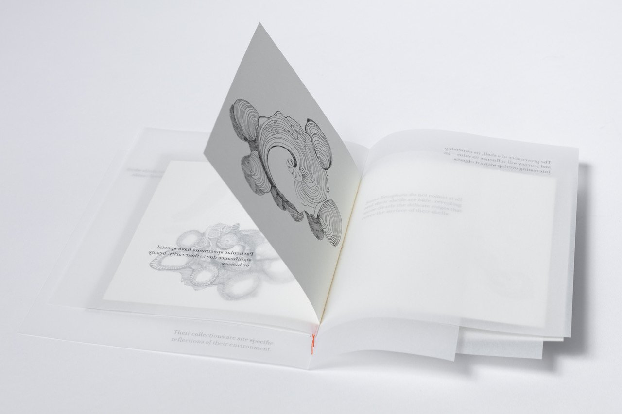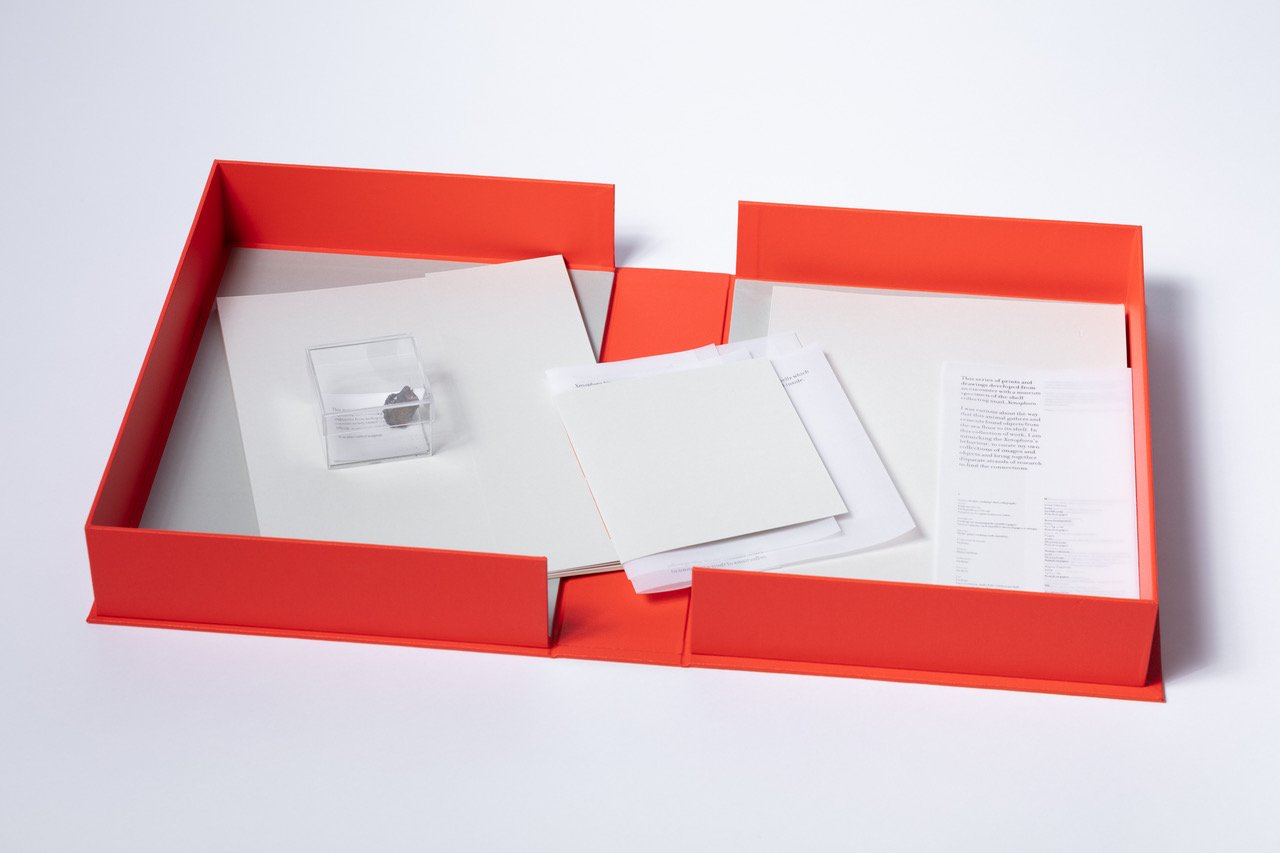 The box contains a folder containing eight etchings and one collagraph on Somerset Satin 300gsm (each 250 x 360 mm); a folder with five digital printed booklets; a small hand-stitched book and a small specimen box containing a fragment of slag.